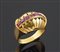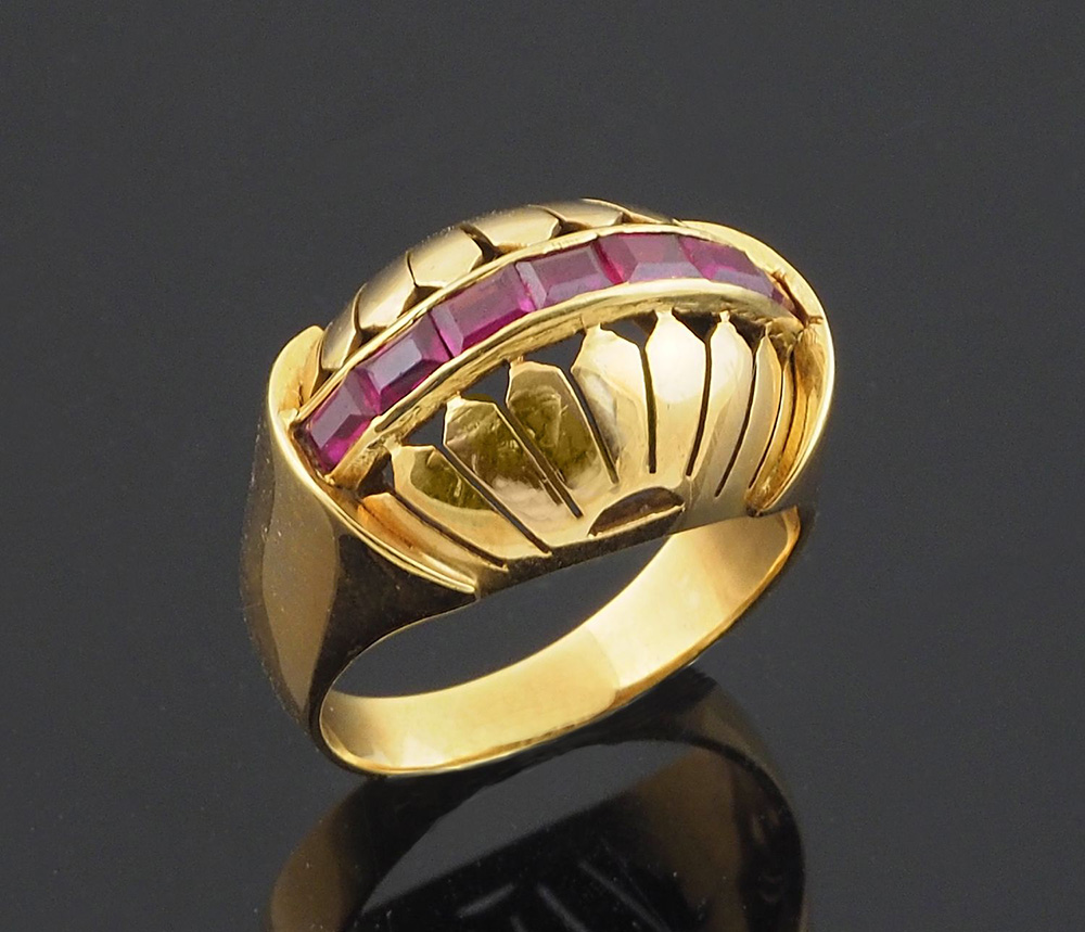Anello a cupola in oro giallo con fila centrale di rubini, anni '40