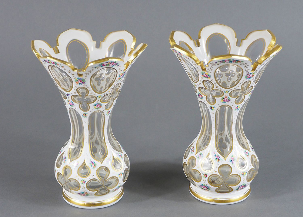 Coppia di vasi portafiori incamiciati bianchi con decori floreali. Boemia,...