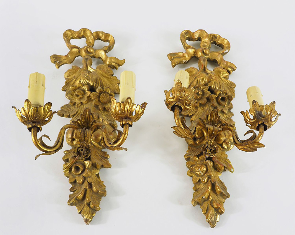 Paio di appliques in legno dorato e metallo dorato a 2 luci. H. cm. 44.
