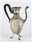 Grande caffettiera in argento con manico in legno, poggiante su piedi ferini e palmette. Genova, XIX secolo. H. cm. 27. (difetti e mancanze).