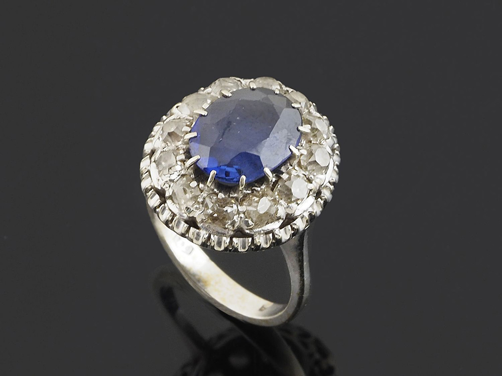 Anello in oro bianco a cupola, montatura a traforo, al centro pietra blu circondata da 12 diamanti taglio antico, pimi '900