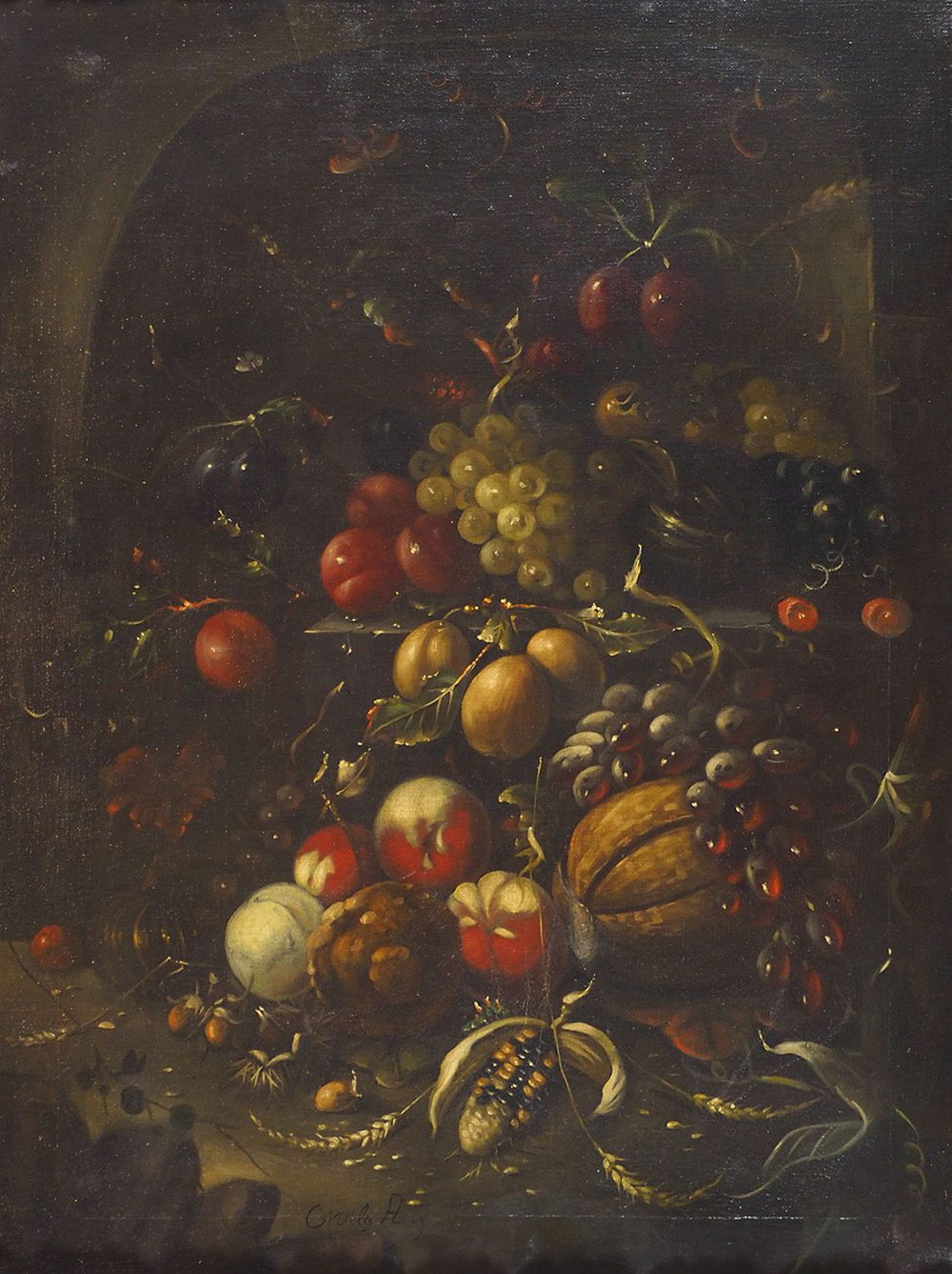 Pittore del XIX secolo "Ricca natura morta" cm. 80x60 - olio su tela foderata Firmato b. al centro.