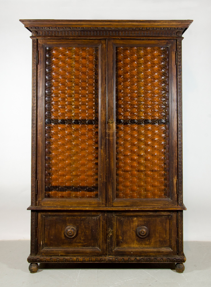 Armadio/monetiere a due ante a vetri e due piccole ante nella parte inferiore. cm. 196x130x44.
