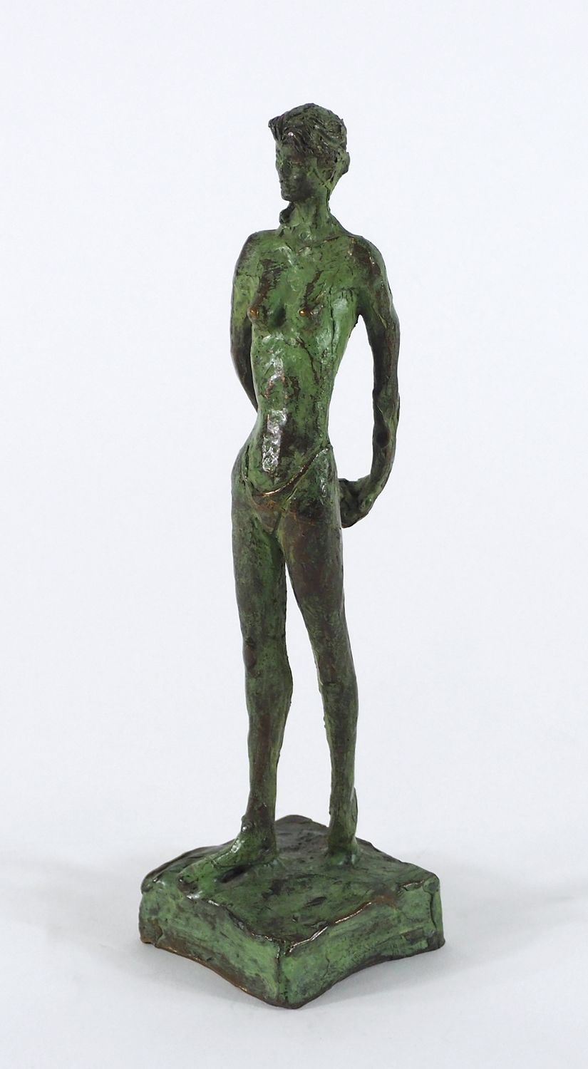 Scultura in bronzo a patina verde raffigurante modella. Sigla incisa M. H....
