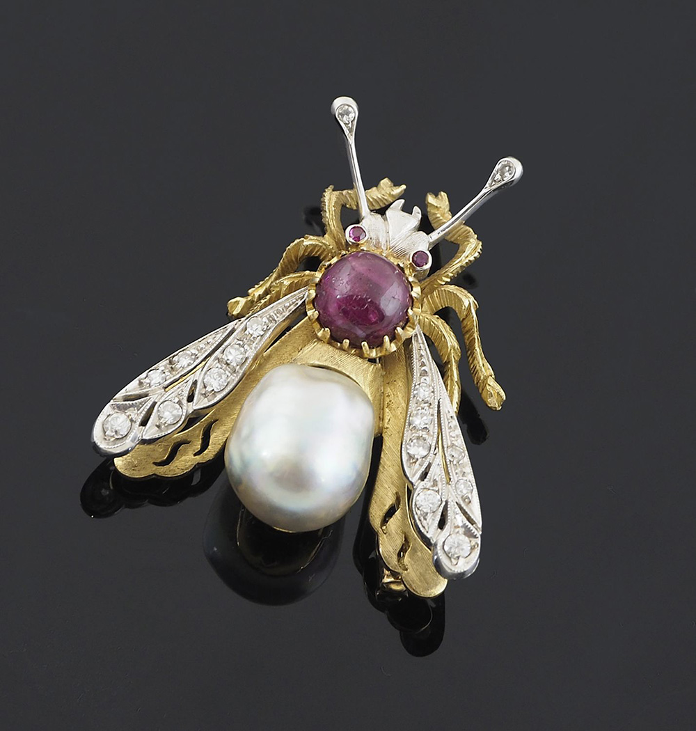 Spilla in oro bianco e giallo a forma di calabrone con perla, rubino cabochojn e diamanti