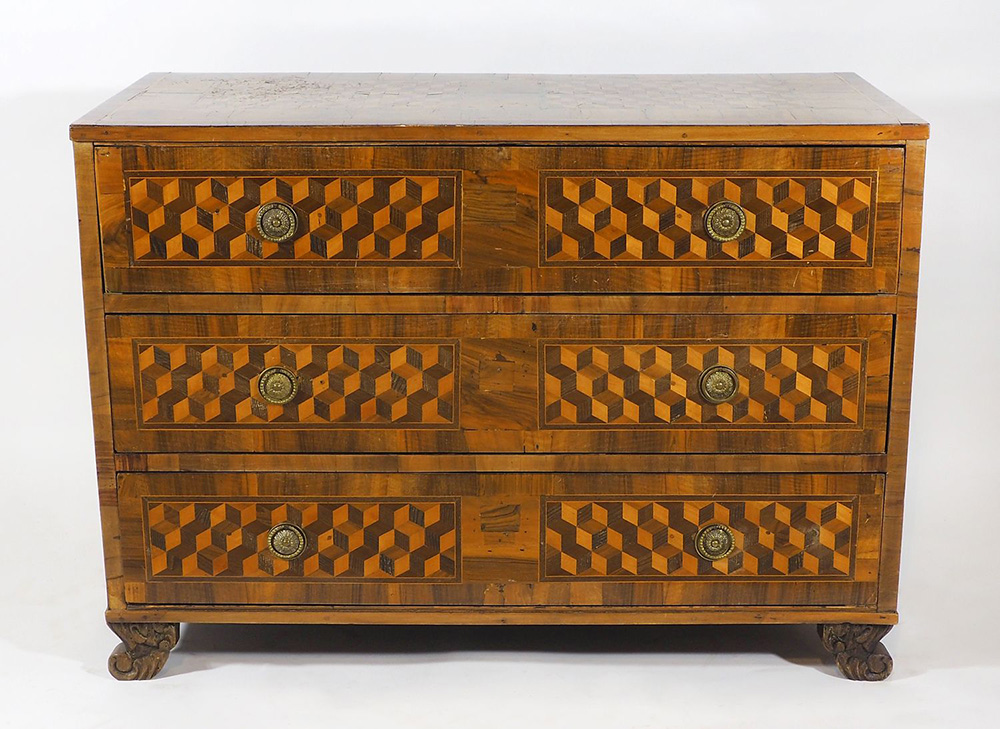 Cassettone in legno a 3 assetti, fronte e piano finemente intarsiati in legni vari a motivi geometrici. cm. 91x126x62.