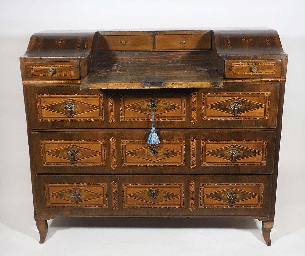 Cassettone in legno a 5 cassetti e calatoia, decorato ad intarsi in legni vari a motivi geometrici e filettature. Trentino, XVIII secolo. cm. 114x131x58.