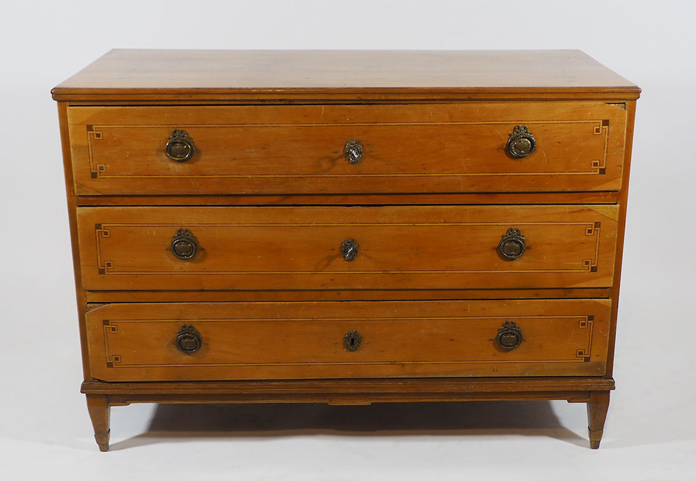 Cassettone in legno a 3 cassetti con intarsi a filettature in legni vari. cm. 90x128x62.