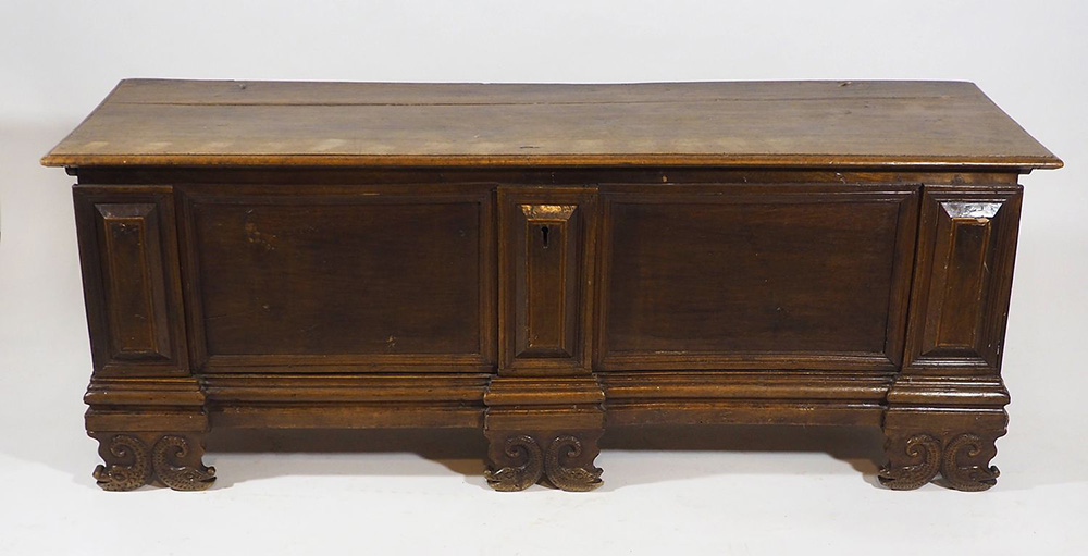 Lotto 356 | Cassapanca in legno con fronte a formelle. cm. 61x164x53.
