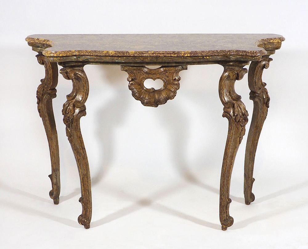 Lotto 359 | Consolle in legno su alte gambe mosse scolpite, piano sagomato in marmo....