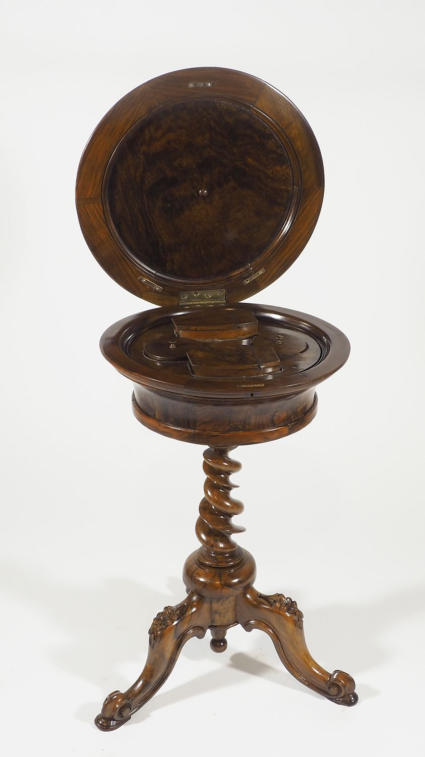 Tavolino da thè in legno con piano apribile, interno con scomparti. XIX secolo.