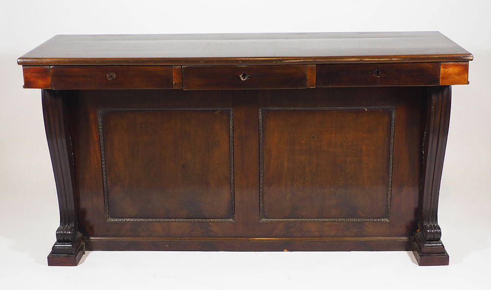 Lunga consolle in legno di mogano a 3 cassetti, gambe laterali scolpite. cm. 87x160x49.