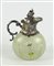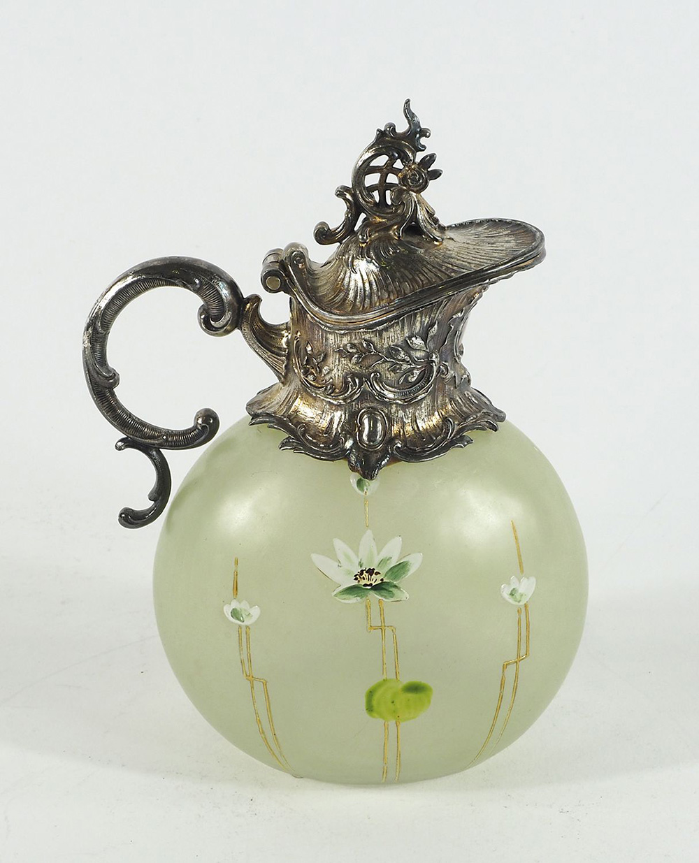 Bottiglietta in vetro dipinto a motivi floreali con collo e manico in argento. H. cm. 18.