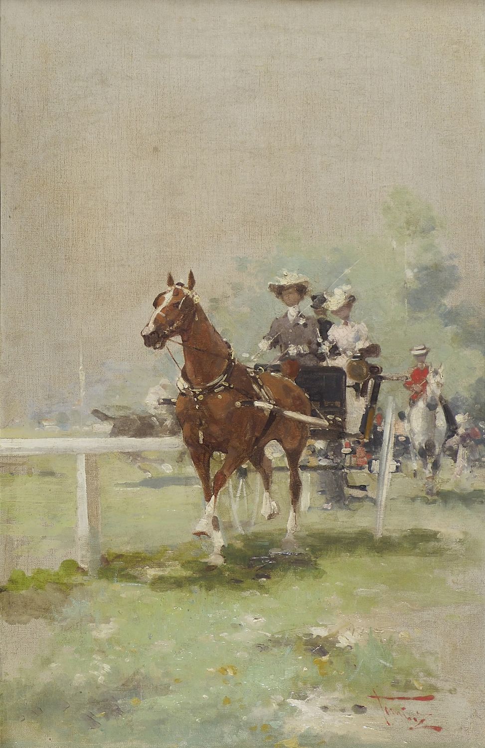 Alfredo Tominz Trieste 1854-1936 "Passeggiata in carrozza" cm. 58x38 - olio su tela Firmato b. a d.
