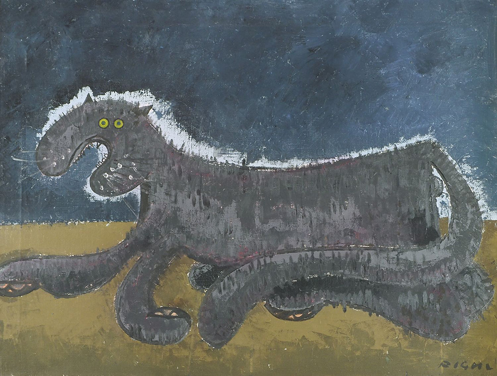 Federico Righi Trieste 1908-1987 "Gatto nero nella notte" cm. 60x80 - olio su tela Firmato b. a d. Al retro firma, titolo e data 1969.