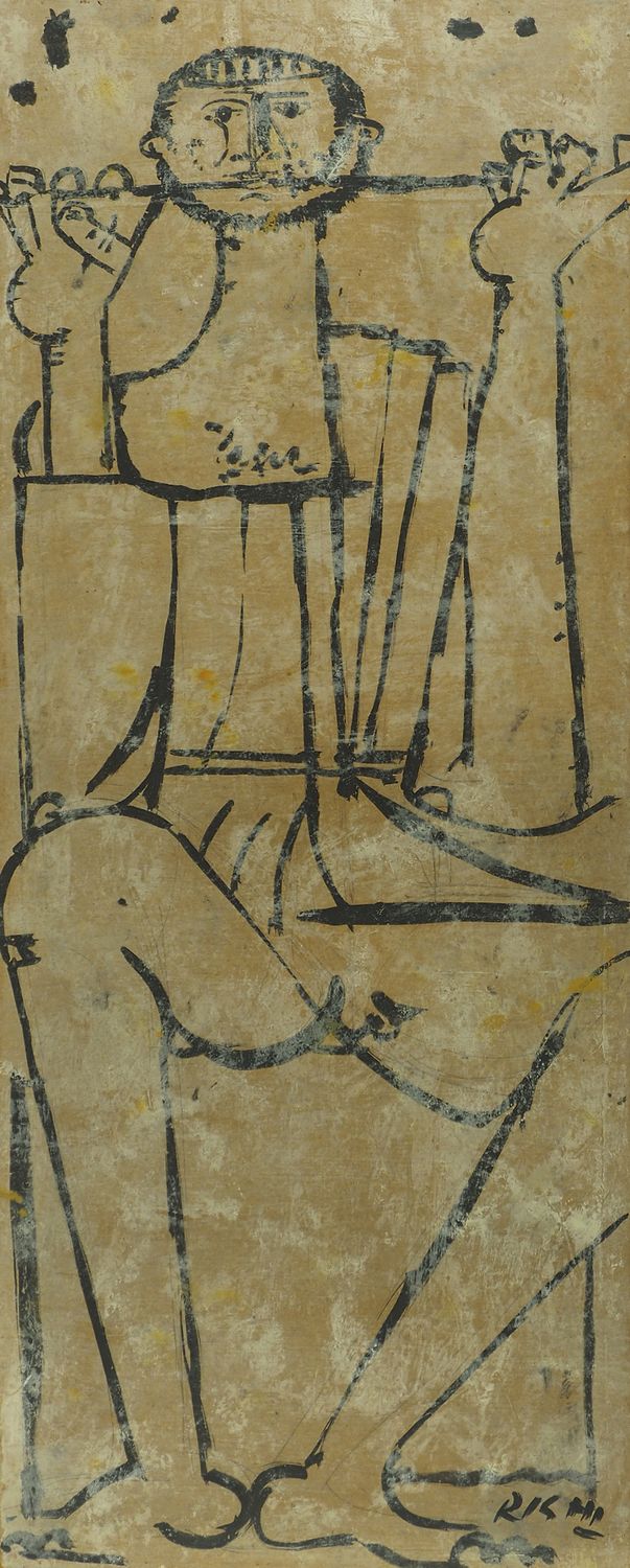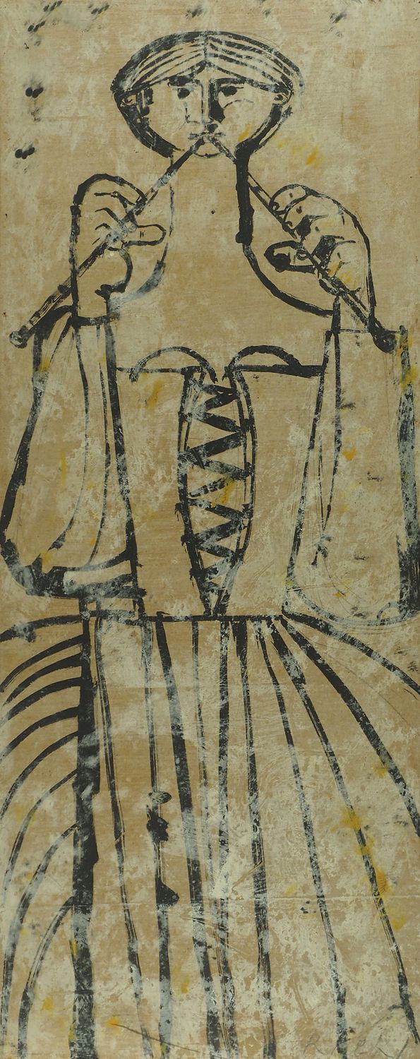 Federico Righi Trieste 1908-1987 Lotto di 2 tecniche miste su faesite, cm. 104x42: a) "Uomo suonatore", firmato b. a d. b) "Donna suonatrice"
