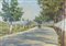 Ugo Flumiani Trieste 1876-1938 "Strada di Fiume" cm. 38x53 - olio su compensato Firmato b. a s. Titolo al retro. Pubbl.: catalogo "Ugo Flumiani, la costa della Venezia Giulia da Monfalcone alla Dalmazia" di L. Nuovo n. 20, pagg. 214 e 257.