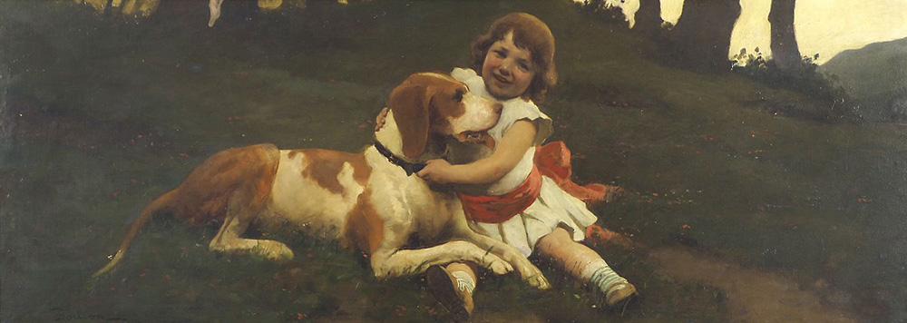 Giuseppe Barison Trieste 1853-1931 "Coccole nel prato" cm. 40x80 - olio su tela Firmato b. a s.