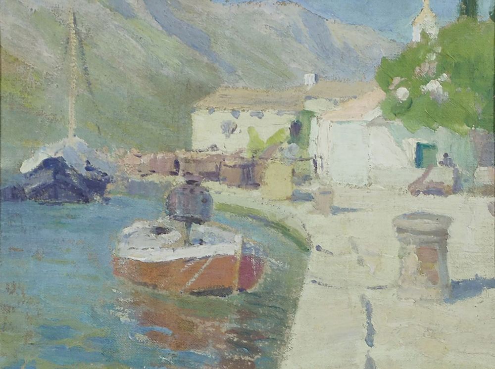 Enrico Fonda Fiume 1892-Parigi 1929 "Porticciolo istriano" cm. 20x25 - olio su tela Al retro timbro Atelier Fonda. Prov.: asta dipinti di E. Fonda, Stadion Trieste, 10/2001.