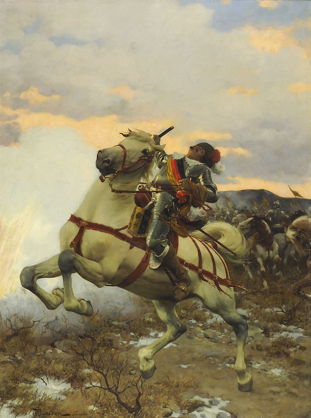 Giuseppe Barison Trieste 1853-1931 "Guerriero a cavallo" cm. 64x48 - olio su tela Firmato b. a s. e datato Trieste 1893. Al retro etichetta in tedesco con dati dell'opera.