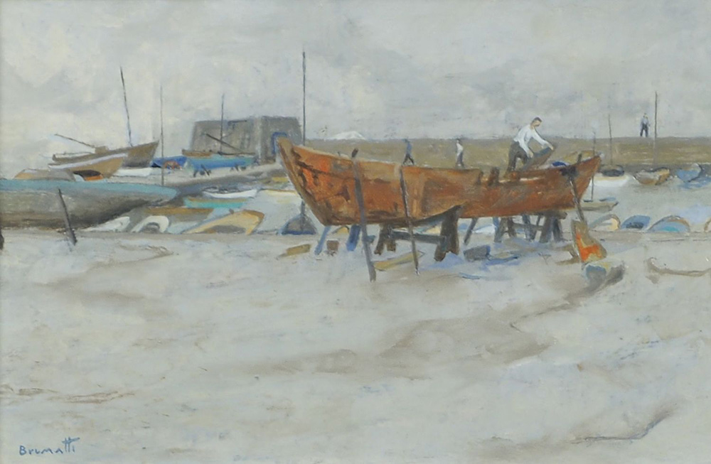 Gianni Brumatti Trieste 1901-1988 "Piccolo squero" cm. 13x20 - olio Firmato b. a s.