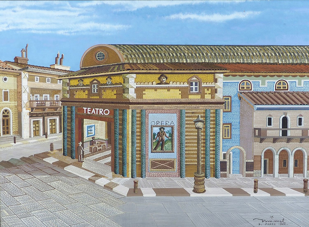 Vito Timmel Vienna 1886-Trieste 1949 "Teatro" cm. 48x66 - tempera su cartoncino Firmato b. a d. e datato 3 marzo 1944. Al retro etichetta con scritto: "SOGNO per la strada entrato per entrare al Teatro un amico mi ha pagato l'entrata. Piccolo Teatro meravigliosa opera meravigliosa, sogno. 7 dicembre 1943, Timmel". Pubbl.: catalogo "Vito Timmel" a cura Fondazione CRTrieste 2000, pag. 190 fig. 191. Epsosiz.: "Museo della follia" di V. Sgarbi, Palazzo della Regione Mantova 2015, fuori catalofo.