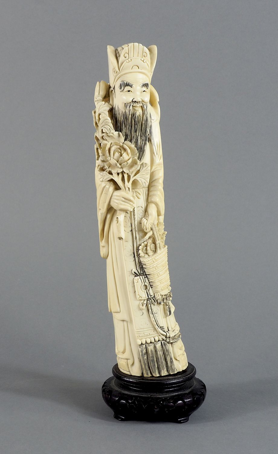 Scultura in avorio finemente scolpito raffigurante personaggio orientale, su base in legno. Inizio XX secolo. H cm. tot 32.