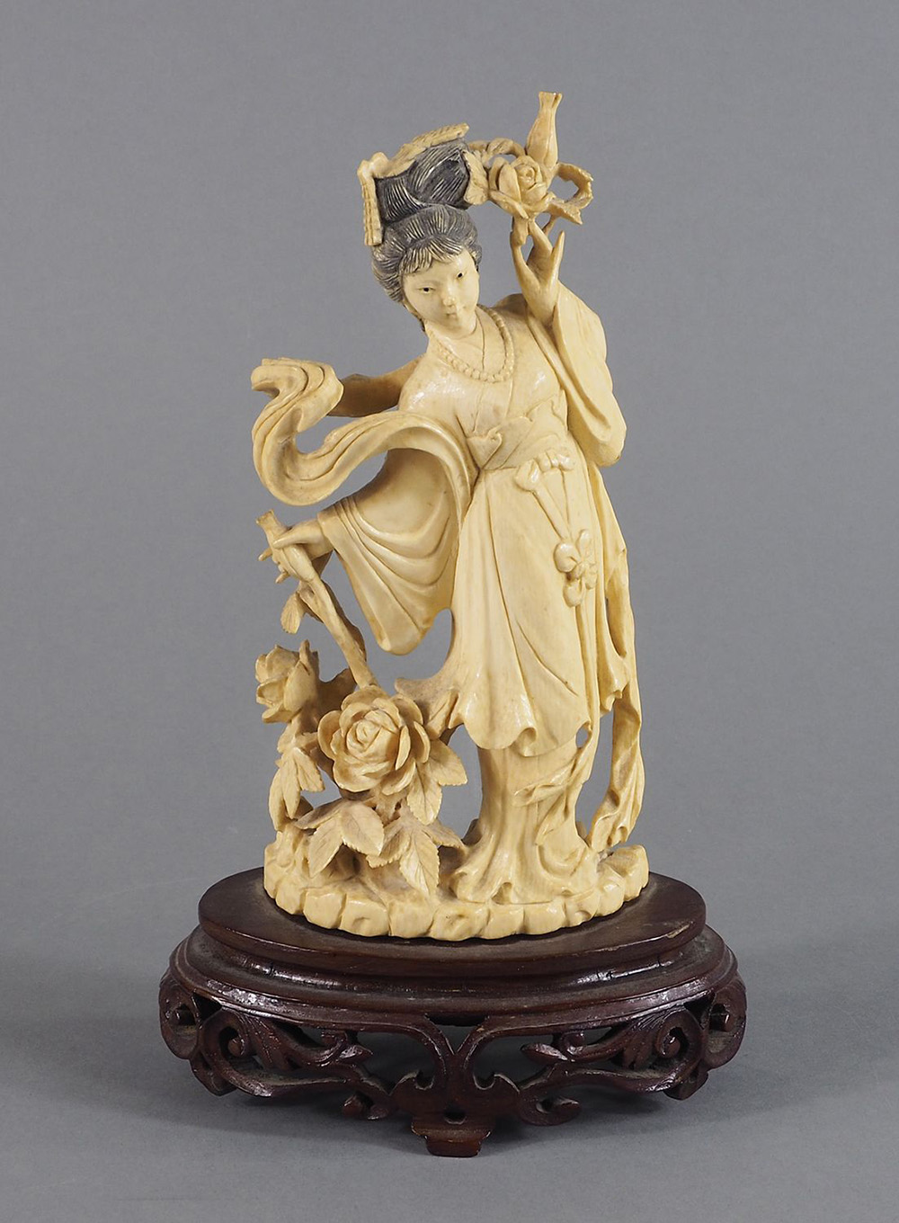 Scultura in avorio finemente scolpito raffigurante figura orientale, su base...
