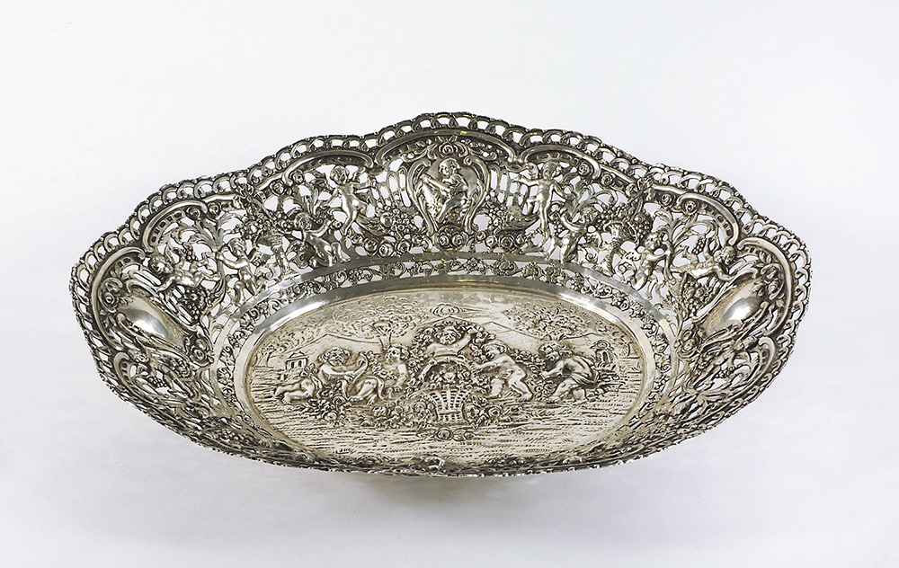 Centrotavola in argento con bordo traforato con figure di putti. Fine...
