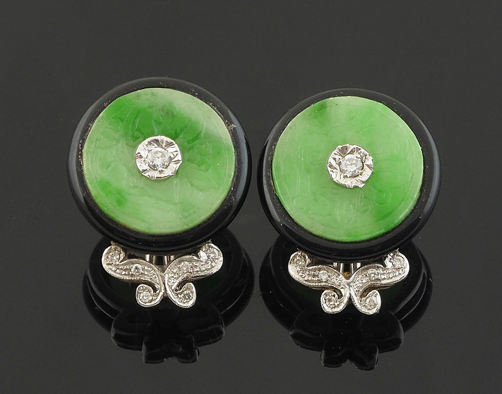 Paio di orecchini di forma circolare in giada, onice e oro bianco con brillante centrale.