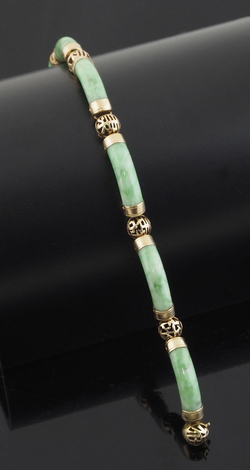 Bracciale semirigido composto da segmenti in pietra dura verde congiunti da elementi in oro giallo