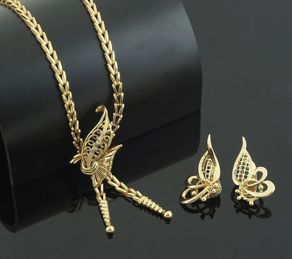 Parure in oro giallo composta da girocollo con pendente e paio di orecchini lavorati a traforo. Gr. tot 30,5.