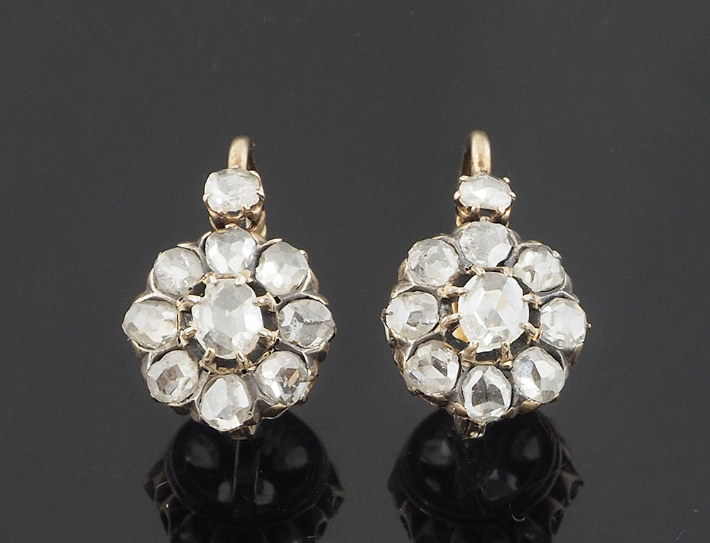 Oreccchini a monachella in oro rosè con diamanti taglio a rosa, primi '900