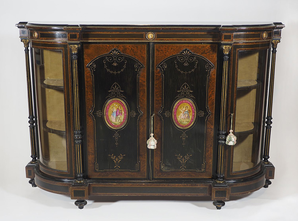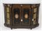 Credenza in legno scuro a 4 ante con medaglioni dipinti raffiguranti personaggi, applicazioni in bronzo dorato e colonnette laterali. cm. 114x162x43.