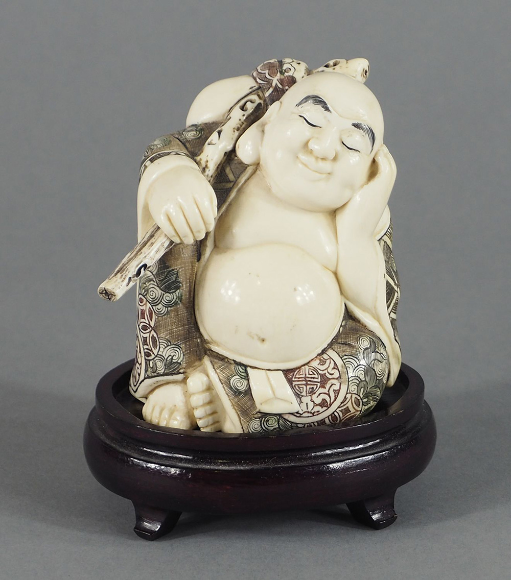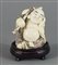 Scultura in avorio scolpito raffigurante Buddha, base in legno. H. tot cm. 11,5.