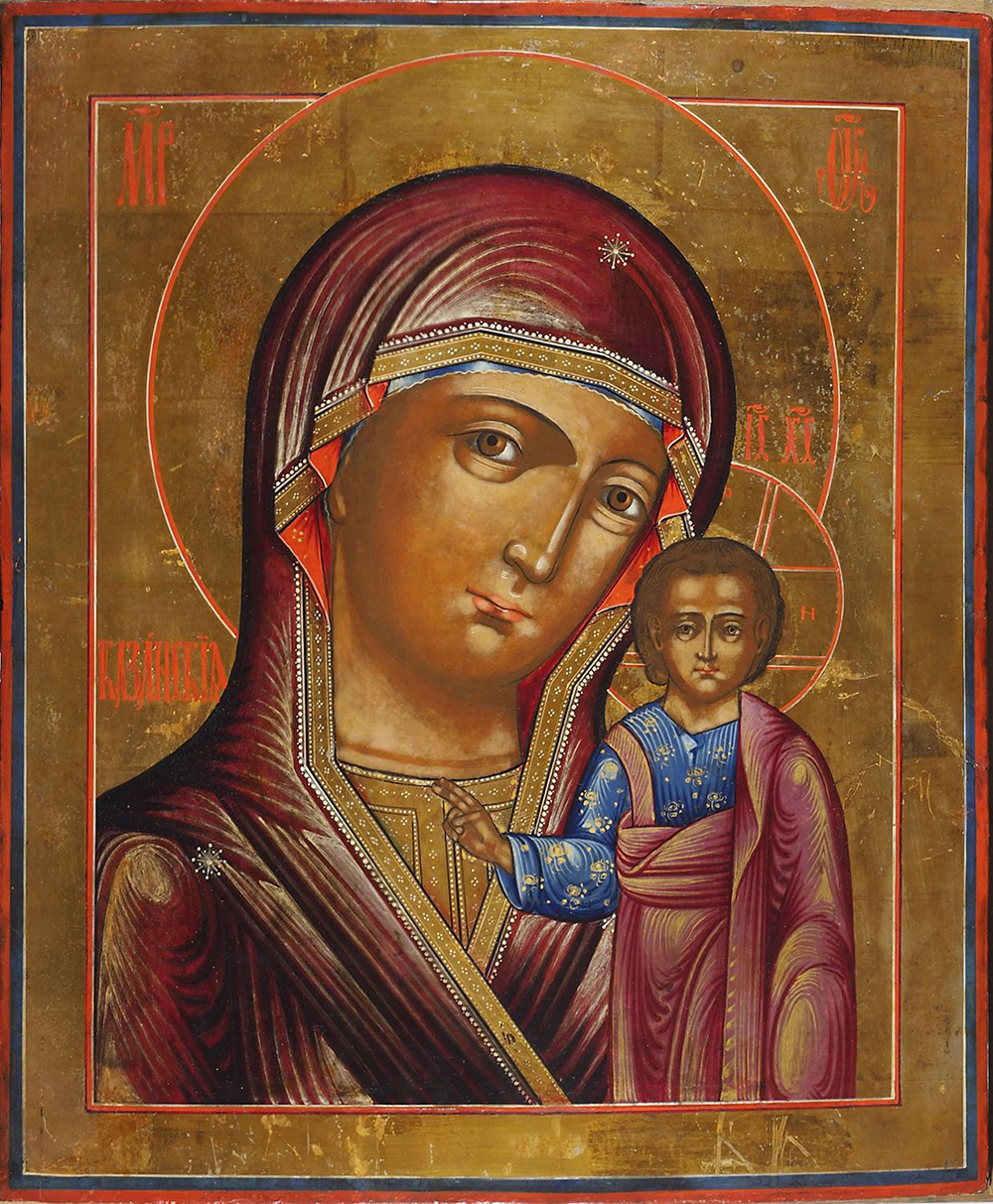 Icona dipinta su tavola raffigurante Madonna con bambino. XIX secolo. cm. 45x37.