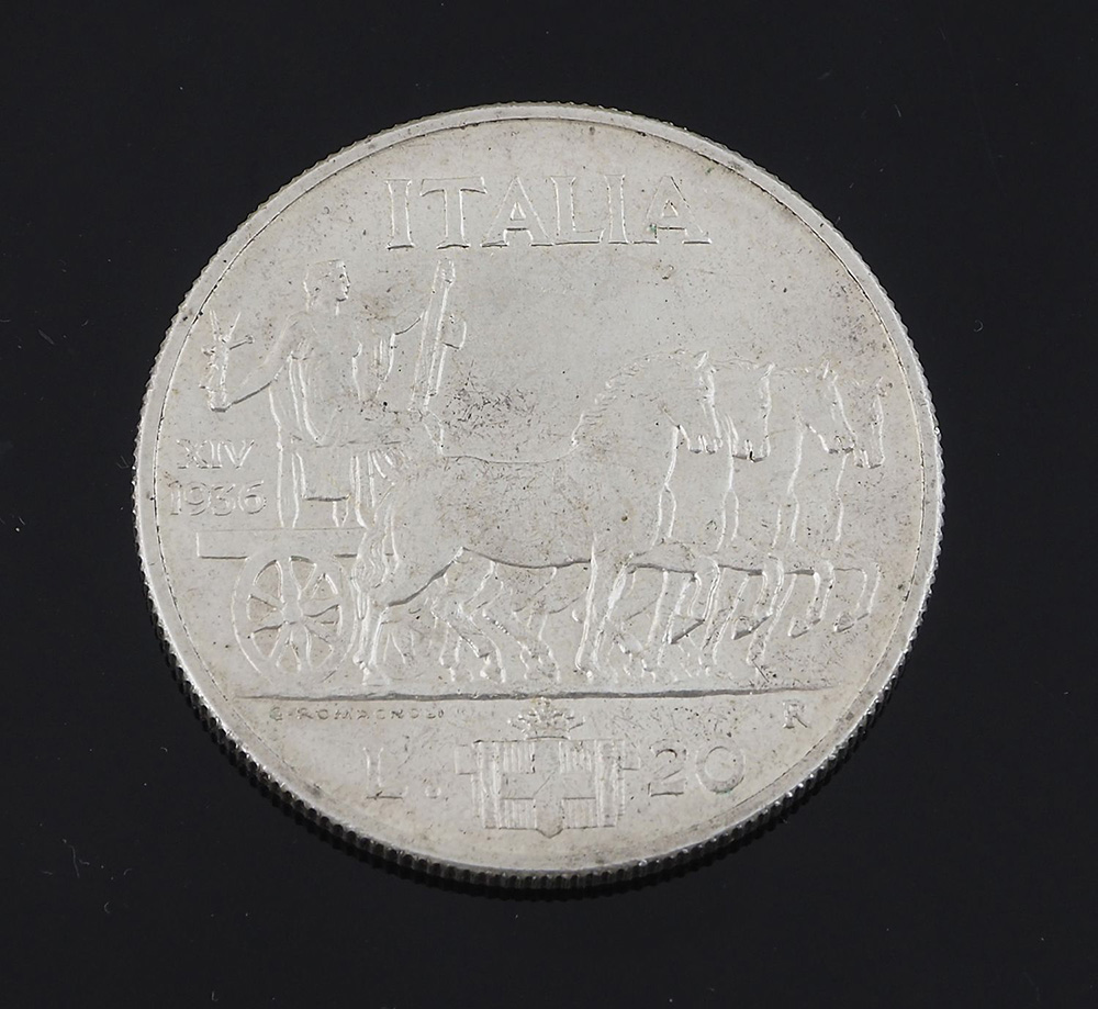 Moneta da 20 lire in argento "Vittorio Emanuele III", 1936. Perfetta.