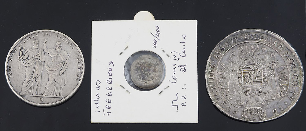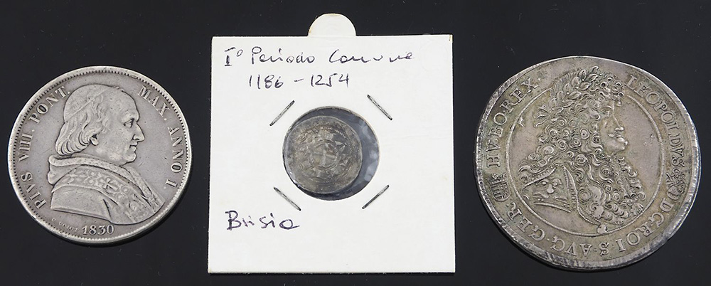 Lotto di 3 monete: a) moneta Denaro scodellato Brescia 1186-1254; b) moneta Tallero Sacro Romano Impero Leopoldo I 1692; c) moneta Scudo Stato Pontificio Pio VIII 1830.