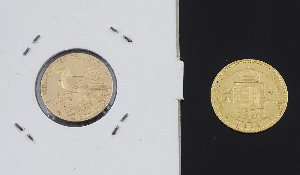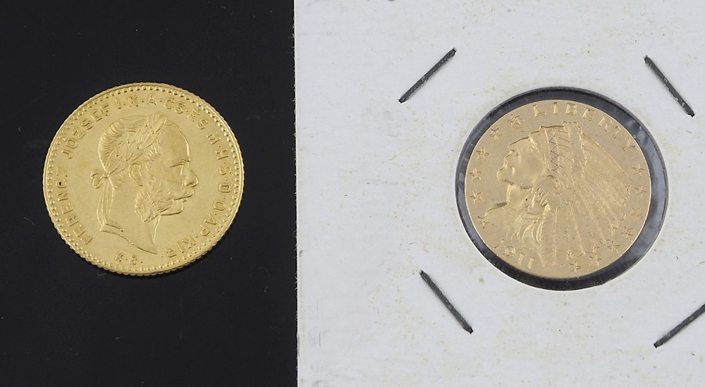 Lotto di 2 monete: a) moneta 2 1/2 dollari in oro Testa indiano USA 1911; b) moneta da 4 fiorini in oro Francesco Giuseppe 1888.