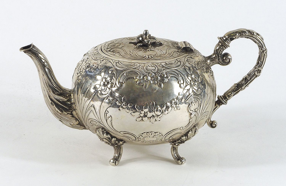 Teiera in argento lavoratoa a sbalzo, con manico. Nord Europa, inizio XX secolo. Gr. 640.