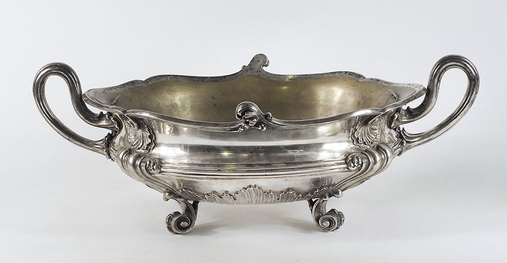 Grande centrotavola in argento di forma ovale con manici laterali. Punzone A....