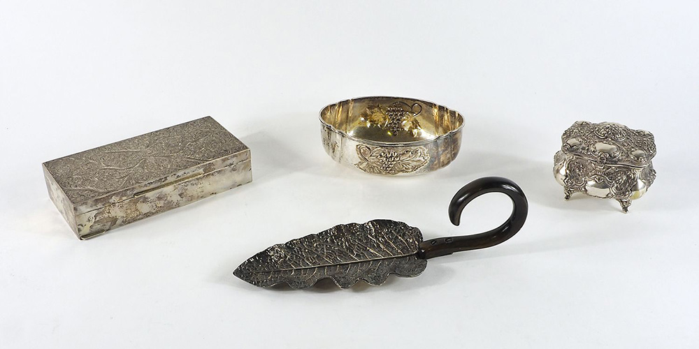 Lotto 644 | Lotto di 4 oggetti in argento tra cui scatola. Gr. 1190.