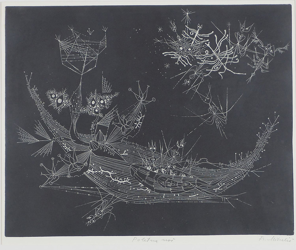 France Mihelic 1907-1998 "Sera d'estate" cm. 35x42 - incisioe Firmato b. a d. Titolo in sloveno "Poletna noc".