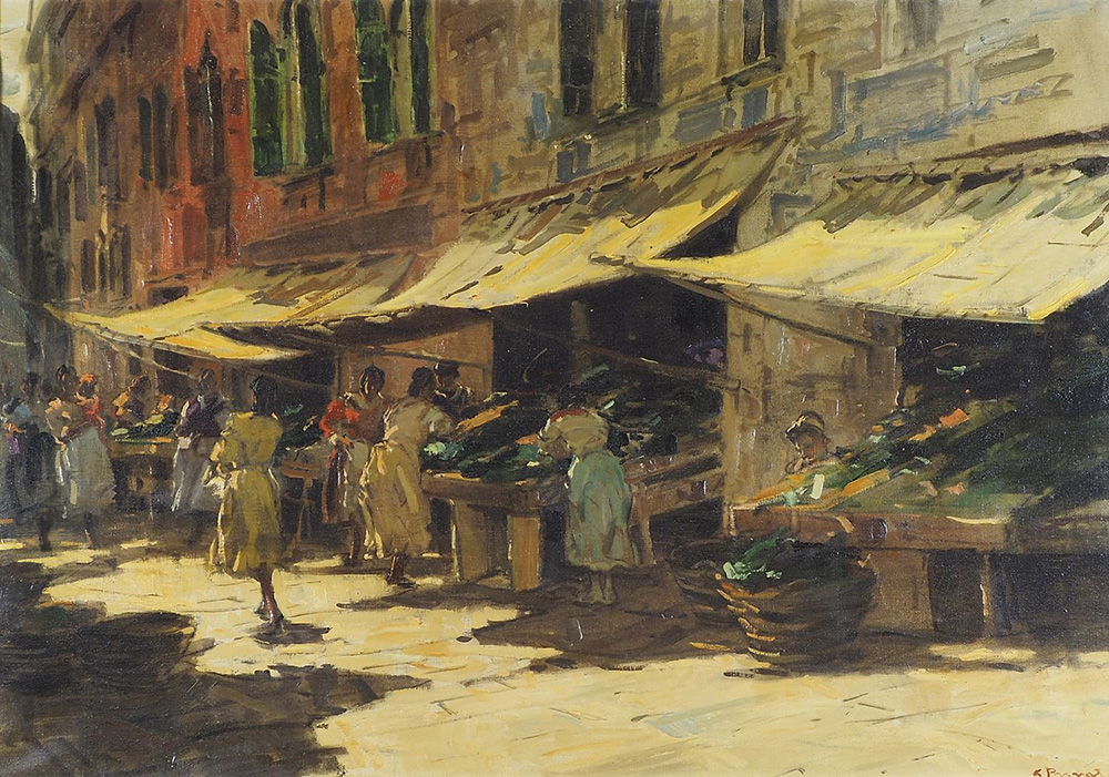 Cosimo Privato 1899-1971 "Spesa mattutina" cm. 70x100 - olio su tela Firmato b. a d. Titolo al retro e dedica firmata dall'Artista..