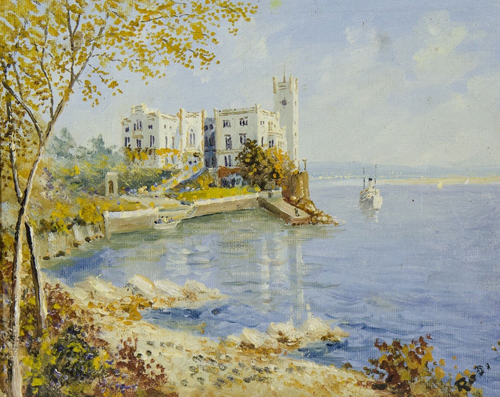 Roda "Castello di Miramare" cm. 24x28 - olio su cartone Firmato b. a s.