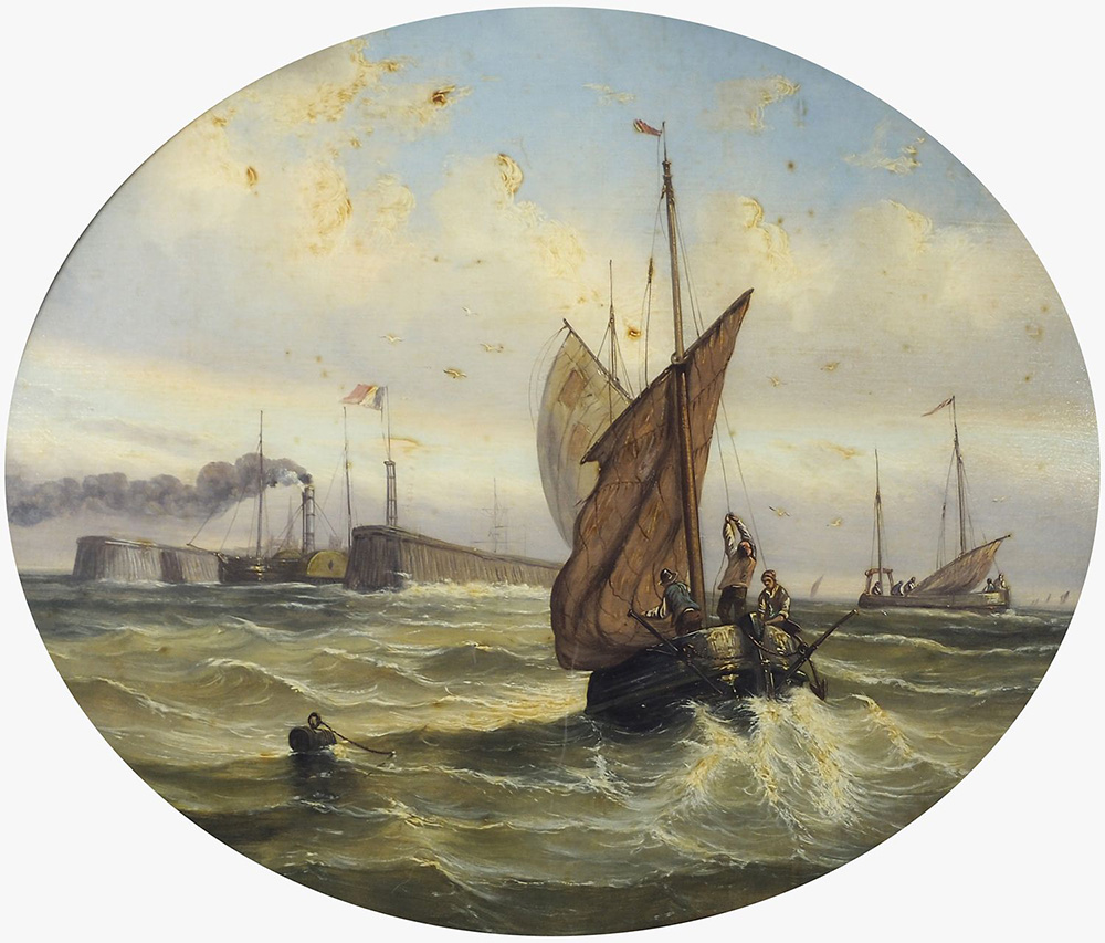Maestro del XIX secolo "Marina con barche" cm. 46x54 - olio su vetro (formato ovale)