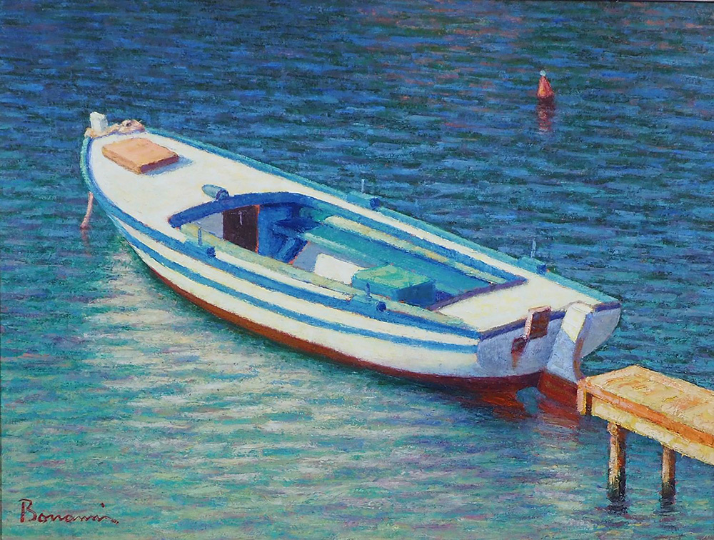 Claudio Bonanni Tivoli 1960 "Barca al molo" cm. 46x62 - olio su tela Firmato b. a s. Al retro firma dell'Artista e titolo.