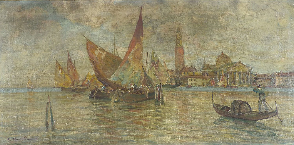 Maestro primi '900 "Barche a Venezia" cm. 40x80 - olio su tela Firmato G. Moretti b. a s.
