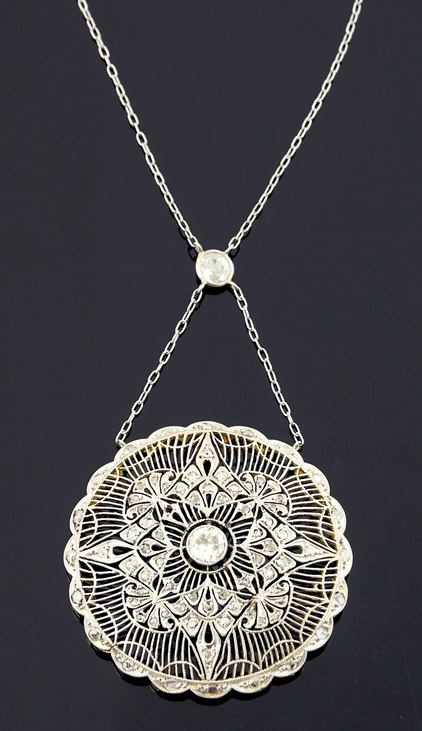Lotto 846 | Pendente oro bianco di forma rotonda con lavorazionea traforo, al centroe...