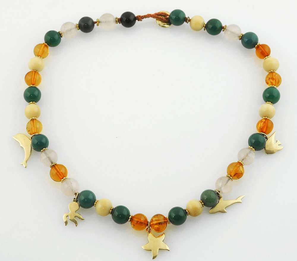 Collana Pomellato ad un filo di boules di pietre multicolore, ambra, avorio, quarzo rosa, agata, onice e giada con 5 ciondoli e bgiusura in oro giallo